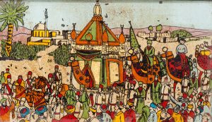 UN FIXE SUR VERRE LE MAHMAL. La caravane égyptienne se dirigeant vers la Mecque. Un fixé sur verre représentant le chameau portant la kiswa et le tapis et la caravane de pèlerins se dirigeant vers la Mecque. 22.5 x 13 cm à vue, s. cadre.