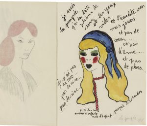 Importante correspondance amoureuse au réalisateur [Anne Colette a joué dans 4 films de Marc Allégret : Futures Vedettes (1955), En effeuillant la marguerite (1956), Sois belle et tais-toi (1958), Les Affreux (1959) ; leur histoire semble avoir pris place durant ces quatre années]. Quelques lettres évoquent également les rôles que Marc Allégret lui confie, dont une après avoir tourné En effeuillant la marguerite avec Brigitte Bardot : « Crois-tu que je sois sans réactions quand un journaliste ou un acteur me demande pourquoi tu ne me donnes pas un joli rôle intéressant (tu sais bien que ce n’est pas un premier rôle mais un second). Ils me demandent pourquoi tu ne me donnes pas ma chance puisque tu le peux mieux qu’un autre et certains [...] sont méchants et lucides, que dire de cela ? »... à propos de Prudence, son prochain rôle dans Sois belle et tais-toi, qu’elle sait « très active [...] mais ce sera tout de même encore un personnage autour de l’histoire ou plus exactement autour des autres. Vous essayez de placer ce qu’il y a de plus commercial possible dans votre film, sans oser quoi que ce soit »... Souhaitant obtenir son avis sur son travail, elle lui envoie quelques manuscrits et tapuscrits de ses nouvelles (La Cabane, dédié à Marc Allégret en août 1955, Tréboul, Petits contes au fond d’une mémoire, Les grandes vacances...), des esquisses de scénarios (Scénario rêvé en 1958, Histoire pour un film)... On trouve également des bribes de dialogues sur des feuilles éparses, quelques poèmes, chansons, dessins, citations... On joint un important dossier de dessins d’Anne Colette, certain légendés, la plupart représentant des femmes. Plus quelques photos et un agenda.