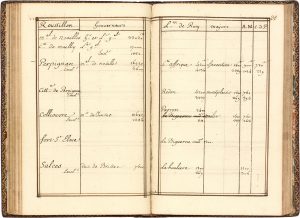 Très intéressant manuscrit qui présente, région par région, ou ville par ville, les appointements des principaux officiers des gouvernements, d’abord le gouverneur lui-même, puis, dans les autres colonnes, le « Lieutenant de Roy » qui le remplace dans le commandement des places de guerre pendant ses absences, puis les majors et aide-majors (abrégé : AM), enfin les simples capitaines de place (abrégé : Cap.d.P.). Les titulaires sont nominatifs, jusqu’aux majors inclusivement. Au XVIIIe siècle, les gouvernements formaient, parmi les divisions militaires et politiques du royaume, la plus étrangère à toute réalité contemporaine : au nombre de 153 (dont 18 de première classe, 21 de 2e), ces circonscriptions employaient jusqu’à 2207 personnes avant l’ordonnance de réduction de 1776. Leur ressort allait d’une vaste région (Languedoc) à des places de guerre (Le Havre, Blaye, etc.), voire à des établissements royaux (les Invalides, la Bastille, le palais de Versailles, Trianon, les châteaux de Chambord, de Compiègne, etc.) Le volume comprend : Hôtel royal des Invalides ; établissements royaux de Paris ; Île-de-France ; Picardie ; Artois ; Flandres ; Hainaut ; Champagne ; Trois-Évêchés ; Alsace ; Comté de Bourgogne ; Duché de Bourgogne ; Bresse ; Lyonnais ; Bourbonnais ; Nivernais ; Auvergne ; Limousin ; Languedoc ; Roussillon ; Béarn ; Guyenne ; Aunis ; Poitou ; Angoumois ; Saintonge ; Berry ; Orléanais ; Touraine ; Maine ; Anjou ; Bretagne ; Normandie ; Dauphiné ; Provence ; Bigorre ; Foix ; Rouergue ; Lorraine. Ex-libris G. Cottreau.