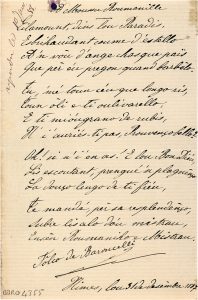 Cinq poèmes en provençal adressés à Joseph Roumanille, en vue de publication dans l’Armana Prouvençau : Lou Castéu doú Roúre, long poème sur l’hôtel particulier des Baroncelli, Nîmes 1er mai 1887 ; A-n-Avignoun, poème de 7 strophes, Nîmes 27 mai 1887 (annoté par Mistral : « poudriè donna mies ») ; À Moussu Roumanille, hommage à Roumanille et Mistral, Nîmes 13 décembre 1887 ; Recor, charmant poème amoureux, Avignon 7 juillet 1889 ; « Eu ribo dou vièi Rose », poème épicurien, Avignon 1891 (un vers corrigé par Mistral)... 2 L.A.S. à Joseph Roumanille en provençal, Nîmes 3 et 27 mai 1887 : il lui adresse des vers, lui parle du Félibrige, etc. – 3 L.A.S. à son amie Thérèse Boissière (fille de Roumanille), 1896-1920, en provençal, belle correspondance amicale... – 2 L.A.S. en français, Avignon 16-17 juin 1915, à une amie [probablement Jeanne de Flandresy] qui fait tout pour le sortir du mauvais pas dans lequel il se trouve pendant la guerre [à la suite de propos antimilitaristes qui auraient pu lui valoir le peloton d’exécution, il échappe de peu au conseil de guerre et est emprisonné en 1915] : « Que de peine je donne à tous mes amis ! Espérons en la justice de Dieu »... On joint un intéressant dossier autour de cette affaire Baroncelli-Javon, comprenant 7 L.A.S. de Jeanne de Flandresy à sa grande amie Thérèse Boissière (« Agricolette »), sur ses démarches pour aider Folco de Baroncelli ; des copies dactylographiées de lettres à et de divers correspondants ; une l.a.s. de la marquise de Baroncelli-Javon à Mme Roumanille, etc.