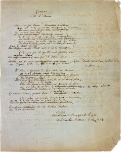 Très bel ensemble du « Félibre Irlandais ». Amélie-les-Bains 1864-865. 3 poèmes pour l’Armana prouvençau, couverts de corrections et additions autographes de Mistral, qui corrige aussi le prénom William en Guihèn : Gramaci à l’Amour (Grand Merci à l’Amour), L’Avuglo di Baus, Lou Paumié… – Woolley Hill House 4 octobre 1866. Billet en français à Roumanille accompagnant plusieurs poèmes en provençal : « si vous aviez de la place dans l’Armana de 67 j’en serai bien-aise de les faire rentrer dans la collection. Je crois que vous trouveriez le Nouvè pas mal, et assez natural & moral pour vos lecteurs ». Il a aussi composé des pièces en « ancienne langue des troubadours, c’est-à-dire, du XIIème siècle – le seul peut-être depuis le Roi René ». – Manuscrit de 3 poèmes en provençal : La Machoto, Nouvè (dédié à Gabriel Azaïs de Béziers) ; Li Dous Parpaiouns blanc ; La Lengo Romano (on joint un manuscrit autographe de Mistral refaisant entièrement ce dernier poème). –Waterford, 1880. Manuscrit de 2 poèmes d’après Villon : Lou darnié Felibre !, et Ballado à la façoun de Villon. – [Mai 1891]. Poème Au Tombeù de Roumaniho, à Sant-Roumiè. – Traduction en provençal de 2 poèmes de Walt Whitman : La Musico et La Recounciliacioun. On joint 5 plaquettes imprimées de poèmes : Lou vin dou Felibre (1866) ; La Cansoun Capouliero dou Felibrige (Plymouth, 1877) ; Un Demenche dou Mes de Mai (Montpellier, 1877) ; Septentrioun avec envoi a.s. à Roumanille (Antibes, 1878) ; Nouvè (Noël, 1878). Plus le prospectus de son Parpaioun blu (1868) ; et 2 ouvrages consacrés à Bonaparte-Wyse par Paul Mariéton et Frédéric Donnadieu avec dédicaces a.s. à Roumanille par les auteurs