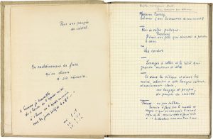 Important cahier inédit de vers et prose, recueillant des réflexions, souvenirs, citations, aphorismes, « idées à noter » et anecdotes, ainsi que quelques des faits et gestes de la vie quotidienne. Le texte présente peu de corrections. Au verso de la page de garde figure un titre-dédicace : « Pour une poupée de cristal. Un enchaînement de faits qu’on chante à sa mémoire »... On lit en regard, cette recommandation de Bousquet à lui-même : « Et dans la critique et dans les notes, aboutir à cette langue extraordinairement claire, un langage de poupée, de poupée de cristal »... Le contenu de ce cahier est principalement littéraire. On y lit, à côté de notes pour son livre Iris et Petite Fumée, des confidences personnelles (sur son enfance et ses parents, sur l’usage de l’opium), des réflexions sur le bonheur, l’homme contemporain, la fatalité, diverses locutions familières ou proverbiales, la Foi dans la littérature contemporaine, et de nombreuses citations (parfois sans attribution) d’Alain, Saint Augustin, Bergson, Flaubert, Lacretelle, Lacordaire, Antoine-Raphaël Mengs (Réflexions sur la beauté et sur le goût dans la peinture, 1786), Paillot de Montabert (Traité complet de la peinture, 1829-1851), Albert Thibaudet…, ainsi que des extraits de critiques sur son œuvre par Jacques Béchot (La Hune), Gabriel Bounoure (NRF), Edmond Jaloux (Les Nouvelles littéraires), Fernand Lot (Comœdia), Carlo Suarès (Cahiers du Sud)... Les références bibliographiques abondent : œuvres de J.F. Angelloz (thèse sur Rilke), Aragon, Bachelard, Barrès, Descartes, Goncourt, R. Huyghe, M. Jacob, Lhote, Maeterlinck, L. Stein, Verne, Wagner, Zola, etc. Les familiers carcassonnais de Bousquet se retrouvent ici : sont nommés Ferdinand Alquié (fréquents échos de leurs conversations), James Ducellier, Jean-Baptiste Fourès, Jean Mistler, René Nelli, ainsi que des domestiques. On relève aussi, sur la première page de garde, les coordonnées à Hanoï d’un fournisseur de « Pilules anti-opium ». Nous ne pouvons citer ici que quelques entrées qui donneront une idée de ce cahier-journal. Le cahier commence par la relation, en 6 parties, de ses efforts pour se ressaisir, depuis qu’une « crise nerveuse » à l’automne lui a révélé la « désaffection générale » qui s’est emparée de lui : « C’est fini de me subir [...] Je quitterai, pour habiter la maison de mes actes, le désert illimité de mes impressions. [...] Je vais avoir quarante ans. On me fait crédit d’une certaine sagesse apparue par hasard dans des livres que j’ai écrits comme en rêve. [...] j’écris, en réalité, pour m’imposer, pour dresser, de force, dans le cadre des institutions sociales une construction entièrement arbitraire et que ses bases négligeables n’empêcheraient pas de concourir avec tout ce qu’édifient les exigences les plus respectables de la nature humaine. Je veux que ma fantaisie et mon caprice tiennent boutique ; et, en ne me servant que de mes jouets, contribuer si bien à l’économie des autres que le soleil semble, comme on dit, s’être levé pour moi aussi. Avec mes livres, lus par plaisir, mon stylo et ma papeterie, je veux, sans sortir de ma vie d’enfant, et d’autant plus aisément que je m’y enfoncerai davantage, forcer les existences les plus viriles et les plus laborieusement réglées à se reconnaître dans la mienne [...] Je m’efforce de devenir un homme du métier. Je me berce de l’espoir que le métier, en moi, va manger l’homme. J’écrirai des œuvres impersonnelles »... Etc. Suit un poème en prose, Les Yeux bleus : « La chair scintille aux approches de l’hiver, elle découvre avec les yeux du songe les myosotis des premiers froids »… Réflexions sur la modernité et l’imaginaire. « Loin du temps où l’imagination intervenait pour approprier à la vie ce qu’elle laissait en nous d’inemployé. Loin du temps où l’imagination restituait sa singularité sous la forme d’un chapitre supplémentaire à juxtaposer à l’existence. Aujourd’hui, c’est le fantastique qui est le réel. Je veux dire : le réel absorbe toute l’imagination. L’homme a mis ses mains à l’accomplissement de son rêve. Le rêve qui nous aidait à supporter la vie réelle, c’est la réalité qui le poursuit [...] Surveille ta vie, poète ! Saisis-en le fil ! Ton cœur bat de travers parce que des voix tonnent dans la cuisine. Comme si tu souffrais de penser qu’un enfant sans force remue dangereusement des barriques pleines de vent »... Anecdote concernant son ami et futur biographe René Nelli : « Un homme qui discute politique, et commente les moindres actes de Staline, c’est par impossibilité d’agir. Nelli, après avoir fait mine d’agir avec les rad. soc. ne sait que faire avec la carte qu’ils lui ont envoyée pour se rendre au congrès. Il la tourne, la retourne, […] mais recule devant la nécessité de prendre le train et [...] pour se dédommager, abat un interminable parallèle entre Mussolini et Staline où il se montre impitoyablement sévère pour le caractère ondoyant et peu énergique de ce dernier »... Remarques sur les tableaux de sa chambre, salutaires pour « la qualité de l’air » et la stimulation de la curiosité, « pour que je n’expire pas dans l’abîme ouvert entre deux causes d’exaltation. Car, très grave était la crise que, vers l’âge de quarante ans j’ai traversée, grâce à mon goût des œuvres d’art, sans grand dommage. J’avais pénétré le caractère dérisoire de l’ambition qui m’avait soutenu »... Car il écrivait par orgueil, l’orgueil « d’une créature qui veut donner la mesure cosmique des dons qu’il a reçus. [...] Je voulais rendre mon être sensible à travers tout... Et, allons plus loin, si bien enfermer le monde dans mon inspiration que chacun, si grand soit-il, eut à traverser une vie plus grande que la sienne pour arriver