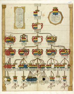 Bel arbre généalogique et héraldique de la famille normande des Clément, seigneurs de Barville, de Feillet, etc., au XVIIe et XVIIIe siècle, calligraphié et peint à la gouache. La Généalogie de Messieurs Clément, de Feillet, de Barville, de Givry, de Boissy, d’Étoges, de Verneuil, de Blavet, de Sainte-Pallaye, est en deux versions : la première est un premier essai, un document de travail, avec de nombreuses ratures et corrections, avec peu d’armoiries peintes ; la seconde présente de nombreuses armoiries peintes, et est une mise au net, destinée à être corrigée et complétée par M. Clément, seigneur de Verneuil… L’ensemble est l’œuvre du baron Étienne-Félix d’Hénin de Cuvillers (1755-1841), colonel d’état-major commandant d’armes de la place et château de Trente (Tyrol), baron de l’Empire (3 août 1810) et donataire en Westphalie ; auteur de plusieurs ouvrages sur la vie militaire, le clergé et le magnétisme, Hénin de Cuvillers fut nommé maréchal de camp à titre honorifique en 1819.
