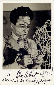 Portrait de Cocteau réalisant une sculpture en fils de fer, dédicacé : « à Babbit – souvenir du Paratyhique 1932 »...