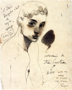 Portrait de Dargelos, torse nu. En haut à gauche : « “l’élève Dargelos était le coq du collège” (Le Sang d’un poète) ». En bas à droite : « Souvenir de Jean Cocteau à Babbit avec mes excuses de l’avoir reçu comme un anonyme ».