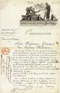 Commission pour Louis-Alexandre Lafosse, de Versailles, à la place de Commis de seconde classe à l’Hôpital militaire de Franciade (St-Denis). Rare et belle pièce avec grande vignette allégorique gravée par Godefroy, représentant Hippocrate soignant un officier soutenu par un soldat et couronné par la Victoire.