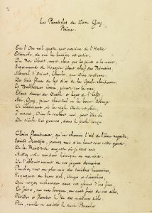 Importante réunion de cinq poèmes. Les Paraboles de Dom Guy. Poème (26 pages, dont 2 impr.). Ce très long poème est un des plus importants des Poèmes barbares. Il fut publié partiellement dans la Revue contemporaine (15 novembre 1859) puis dans les Poèmes barbares (Poulet-Malassis, 1862). Deux pages manquant au manuscrit (p. 23-24) ont été remplacées par le texte imprimé. Le manuscrit a servi pour l’impression ; il présente quelques variantes. « En l’An mil quatre cent onzième de l’Hostie Éternelle, de qui la lumière est sortie, Du Roi Christ, mort, cloué par les pieds et les mains »… Cozza et Borgia. Fragment des États du Diable (10 pages). Ce dialogue entre le Diable, Jean XXII et Alexandre VI fait partie des Derniers poèmes (Lemerre, 1895) ; il a d’abord été publié en 1876 dans La République des lettres (sans les noms des trois interlocuteurs) et en 1880 dans la Jeune France. Le manuscrit est complet, et signé en fin. « Sang de Dieu ! Balthazar, cette harangue est forte »… La Prairie (1 page). Ce beau poème de 6 quatrains sur les Peaux-Rouges a été recueilli dans Derniers poèmes (1895). « Dans l’immense Prairie, océan sans rivages, Houles d’herbes qui vont et n’ont pas d’horizons »… Dans l’air léger... Villanelle (1 page) a été publié dans Le Monde poétique (10 juin 1884) et recueilli dans Derniers poèmes (1895). Ce joli poème de 19 vers est écrit à l’encre violette : « Dans l’air léger, dans l’azur rose, Un grêle fil d’or rampe et luit »… L’Orient (1 page), sonnet, a été publié en 1892 dans Le Livre des sonnets avant d’être repris dans Derniers poèmes (1895) : « Vénérable Berceau du monde, où l’Aigle d’or, Le Soleil, du milieu des Roses éternelles »… Anciennes collections Louis Barthou (II, 1063, ex-libris), Alexandrine de Rothschild (II, 79), puis Daniel Sickles (IV, 1231).