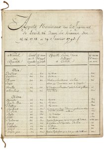 Il y eut beaucoup de ces listes manuscrites en circulation, tant au moment même du procès et des appels, que sous la Première ou la Seconde Restauration (il s’agissait alors de garder la mémoire des régicides voués aux gémonies, et à l’exil en septembre 1815) ; les précisions apposées ici en regard de certains noms (comme à celui de Grégoire, en mission en Savoie pendant les 4 appels nominaux sur la culpabilité et la peine à appliquer, détail qui fut oublié par la suite) penchent en faveur d’une rédaction sous la Révolution. Le tableau donne les indications suivantes, de gauche à droite : les noms des députés répartis selon les départements qui les ont élus ; la réponse aux questions : Louis est-il coupable ?, Y aura-t-il appel au peuple ?, Quelle peine sera infligée à Louis ?, Y aura t-il sursis ou non ?