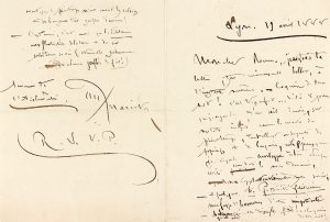 Belle correspondance amicale et littéraire. Les courriers traitent essentiellement de l’Armana Prouvençau, de la préparation des différents numéros de sa Revue félibréenne et des hommages qu’il consacre aux félibres récemment disparus. Paul Mariéton fait régulièrement appel à Roumanille, puis à Thérèse Boissière pour rassembler des textes et échanger des ouvrages. Il est également question de la constitution de sa grande bibliothèque, qui sera, selon son souhait, léguée à la ville d’Avignon après sa mort, et de son ambitieux projet d’histoire de la Renaissance provençale, dont Roumanille et Mistral tentèrent de le dissuader. L’entreprise restera inachevée... Lettres à Joseph Roumanille, son ami « Rouma » et « cher Capoulié ». 9 octobre 1884, félicitations pour l’Armana… Lyon 6 mars 1887, sur les fêtes de Marseille, la diffusion du Félibrige, et son désir de faire le « portrait en pied (à la sauce des origines, de l’enfance du Félibrige) de son maître Rouma… Athènes 2 janvier 1888, voyage en Grèce… Lyon 19 avril, annonçant sa visite avec « le grand poète de Lyon Joséphin Soulary »… 22 mai, au sujet d’un kakémono japonais envoyé par son ami Gégé Primoli, pour être enrichi d’autographes… 8 septembre, sur Mistral qui a « vu choir sur lui la pluie des javelots »… Octobre-novembre, sur la publication de son poème Hellas… 22 décembre, dîner chez Mounet-Sully… Le Saix 15 octobre 1889, il ne pourra se rendre à Tourves, mais enverra son « brinde » ; il doit travailler à la conclusion « capitale » de son livre : « Histoire, Race, Félibrige, tout y passe à fond de train, comme la cavalerie d’Attila »… 11 avril 1890. « Je compte t’adresser demain soir ainsi qu’à notre grand Virgile de Maillane, cette Terre provençale enfin livrée aux bûcheurs bénévoles. C’est gros, c’est inégal, mais c’est bien patriote et bien croyant. Puisse-t-elle te plaire !... »... 8 mai 1890. Il arrivera à Montpellier pour la Sainte Estelle mais n’a pas encore reçu la convocation... Etc. Lettres à Thérèse Boissière. 10 mai 1898, il prépare pour la Revue un hommage à son époux Jules Boissière, et aimerait réunir des lettres marquantes à propos de Fumeurs d’Opium, quelques sonnets à elle dédiés et une notice nécrologique... 8 janvier 1899, à propos d’un projet de publication posthume : « Votre projet fera le plus vif plaisir à tous les amis de Boissière. Je vais me mettre en quête de ses inédits dans mes dossiers »... La mort de Rodenbach l’a bouleversé : « Je l’aimais beaucoup »... Déjeuner avec Sarah Bernhardt : « Nous avons fait pour Orange de fastueux projets »... Lundi matin [mars 1901] : « Je n’ose écrire à Félix Gras, de peur de l’inquiéter ; mais soyez assez aimable pour lui dire l’affectueux intérêt que je prends à sa maladie mais j’en suis maintenant persuadé l’imagination y joue le rôle principal » [Félix Gras décèdera le 4 mars]... 11 [mars 1901] : « La mort du Capoulié nous laisse à tous un douloureux regret de lui. Il était beau et pas de beauté sans bonté, n’est-ce pas ? Je me plains de n’avoir pu le voir en allant à Nice, de n’avoir pas été du cortège de ses funérailles »... 12 octobre 1905 : « Je classe mon capharnaüm, mes archives félibréennes [...] que j’ai accumulées depuis 25 ans !... J’ai fait faire d’autres grandes bibliothèques au rez-de-chaussée de ma maison : l’ordre règne (ou va régner) dans la Cité des Livres ! Je crois fermement qu’après les collections provençales de M. de Vallat à Montpellier, la plus importante bibliothèque générale d’Oc, léguée aux Langues romanes, il y a 20 ans (et non catalogué encore !), de Paul Arbaudd à Aix, la plus rare, bibliophilement parlant, [...] et de Mistral, au Muséon Arlaten, celle de Paul Mariéton que je destine au Palais des Papes est actuellement la plus conséquente. J’espère bien pourvoir donner, et livrer, mon histoire des Félibres, La Renaissance provençale, avec, en appendice, la bibliographie restreinte mais raisonnée qui nous manque »... 29 juillet 1907, sur la Chorégie au théâtre antique d’Orange… 10 août 1907 : « Vous avez été la plus exquise des amies, en ce jour de mon entrée dans la Légion d’honneur. La croix que vous avez eu la charmante idée de m’offrir est là sous mes yeux – par elle je pense à vous »...