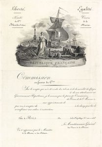 MARINE. Brevet de la Commission des Vivres de la Marine, [circa 1798] ; 1 page in-fol. imprimée, grande vignette gravée en-tête (sous verre).
