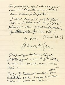 Henri MATISSE. L.A.S., [Nice] lundi [29 août 1949], à Jean Darquet à Vence ; 2 pages in-4, enveloppe.