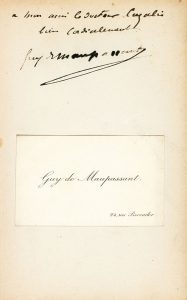 Sixième édition imprimée la même année que l’édition originale. Envoi autographe signé sur le feuillet de garde, à son ami le poète et médecin Henry Cazalis, dit Jean Lahor : « à mon ami le docteur Cazalis / bien cordialement / Guy de Maupassant ». On a collé au-dessous la carte de visite de Maupassant. Ex-libris gravé de Jean Lahor.
