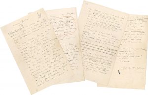 Important ensemble de proses en provençal pour l’Armana Prouvençau de 1874. Breviàri de l’istòri de Prouvènço. Début de la petite chronologie provençale publiée en tête des almanachs, avec les 3 premiers paragraphes, de 1500 avant Jésus-Christ à la « Prouvènço grèco » (1 p.). Crounico felibrenco, signé « Gui de Mountpavoun » (20 p.). Très intéressant récit de la naissance, de l’essor et de l’évolution du Félibrige, et qui fête ses vingt ans… Mistral raconte sa fondation le 21 mai 1854 à Font-Ségugne, par sept amis, et rappelle les statuts du Félibrige pour garder le plus longtemps possible à la Provence sa langue, sa couleur, sa libre personnalité, son honneur national, etc. Lou Nougat, signé « lou Cascarelet » (3 p.), exposé sur la spécialité provençale du nougat. Remoustranço di biou de la Camargo à Moussou lou Menistre de l’Interiour, signé « lou Cascarelet » (8 p.). Amusante lettre des bœufs de la Camargue en faveur de la tauromachie, après l’interdiction des courses et combats de taureaux par le ministre de l’Intérieur… Li quatre questioun, signé « lou Cascarelet » (6 p.). Amusante histoire mettant en scène l’évêque de Marseille Mgr de Mazenod et le curé de Sant-Macèu ; celui-ci, ayant répondu aux quatre malicieuses questions de l’évêque, reçoit mille francs pour réparer son clocher. La leco, signé « F. Mistral » (2 p.). Chronique lexicologique sur le mot leco. Lou Sanctus, signée « lou Cascarelet » (2 p.). Amusante galéjade concernant le curé de la Majour. Lou sèti di Baus, signé « lou Cascarelet » (3 p.). Histoire du siège des Baux de Provence qui, alors que toutes les places fortes de Provence étaient tombées entre les mains des Sarrasins, était la seule à tenir bon. Le valeureux prince Hugues, seigneur des Baux, fit balancer par-dessus les murailles, alors que la ville était réduite au dernier degré de famine, un cochon. Voyant cela, le prince Girofle, émir de Constantine, décida de lever le siège… Li mort, signé « lou Cascarelet » (2 p.). Farce : une nuit de Toussaint, des fêtards sortant du cabaret, se retrouvent dans le cimetière… Lou teisserand e la Santo Vierge (2 p.). Légende provençale : Marie remet à sa place un tisserand malhonnête. La crèmo, signé « lou cascarelet » (1 p.). Histoire drôle. Li cigau, signé « lou Cascarelet » (3 p.). Galéjades et farces à Castèu-Nòu… La crous, signé « lou Cascarelet » (1 p.). Après un sermon du curé de Vernegue, disant que chacun doit porter sa croix, Plantavin porte sa femme : « Frères, je porte ma croix »…. Au verso, Mistral a copié un court poème de Carloun Rieu, Inscripcioun dou cementèri dou Paradou, et rédigé une autre anecdote : Lou dòu (Le deuil), signée « lou Cascarelet ». Li Sourneto de ma grand la borgno. La faveto, signé « Lou Cascarelet » (14 p.). Petit conte des Sornettes de ma grand-mère la borgne, histoire d’un vieux gentilhomme qui plante une petite fève, qui grandit si haut qu’il parvient à y monter pour aller jusqu’au Paradis, où il demande audience à Saint Pierre pour le prier de faire cesser la famine... L’òli de cade, signé « lou Cascarelet » (6 p.). Conte provençal à propos d’un pâtre simple d’esprit, de trois pauvres brûlés dans un four, et d’une jarre d’huile de cade... Li partido de l’iue, signé « lou medecin di toro » (1 p.). Petite chronique lexicologique sur les mots liés à l’œil en provençal. Quàuqui metaforo poupulàri, signé « F.M. » (2 p.). Liste d’une cinquantaine de métaphores populaires en provençal… Lou coumandant Taillant, signé « Gui de Mount-Pavoun » (3 p.). Au sujet du commandant Taillant, « un enfant du Gard », qui tenait la forteresse de Phalsbourg en Lorraine. Devinaio populàri, devinette rimée sur l’olivier. La pereso, proverbe. Lou cant de l’ancelour, « sourneto de Lengadò » (extrait de la Revue des langues romanes). Lou gau, la fedo e lou pijoun, signé « lou tout-obro », fable populaire. (2 p.). Li Cat, signé « lou Cascarelet », devinette au bas d’une épreuve corrigée du texte La Preguiero (1 p.). On joint 8 poèmes retranscrits de la main de Mistral pour le même almanach (10 p.) : La ribièiro de Cesse de Ch. Gleize, La vigno en flous et L’oulivié en flous de Jean-Baptiste Gaut, La misèri de la vido en parler rouerguat d’A. Villié, L’egatado en parler narbonnais d’Estève Gleizes, La dindouleto de F. Estre, Lou caire dóu fio d’Ernest Chalamel, et A-n-Ipoulite Duprat de Marius Bourrelly. Plus 18 autres manuscrits de poèmes (la plupart autographes signés, avec des corrections autographes de Mistral) par leurs auteurs : François Aubert (La proumiero Coumunion de Margarido, retranscrit par Joseph Roumanille), Charles Poncy (Une Noço prouvençalo), Marius Girard (Li Coupaire de bouis), Anfos Tavan (Calèndo et Ma fiho), Antoine-Blaise Crousillat (À la pichoto Antounieto Crousillat, Belugo, L’Innoucènci…), Camille Allary (A-n-Elo), J.-B. Garnier (Lou Moustié de Sant Benedet d’Aniano), Frai Teobald (L’Ange gardian, corrigé par J. Roumanille), Joseph Roumanille (Sant-Antòni, signé « Lou Cascarelet »), Charles Gleize (A moun fiéu Marius), Malachie Frizet (L’Astre), Gabriel Azaïs (Lou pastre), Louis Roumieux (A Roumanillo, signé « Jan de la Tour-Magno »), Félix Gras (À Th. Gautier), François Vidal (Vièi Quatrin, vièi Refrin), Ernest Chalamel (Lou Caire de moun fio et Impromptu, avec L.A.S. d’accompagnement à Roumanille), et Bonaventure Laurens (Lou Rèi di barrulaire, prose).