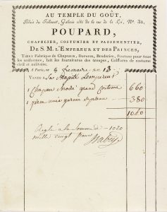 [NAPOLÉON Ier]. Facture du chapelier Poupard, avec apostille autographe signée de Jean-Baptiste Isabey, Paris 8 frimaire XIII (29 novembre 1804) ; 1 page in-4 à en-tête Au Temple du Goût [...] Poupard, chapelier, costumier et passementier, de...