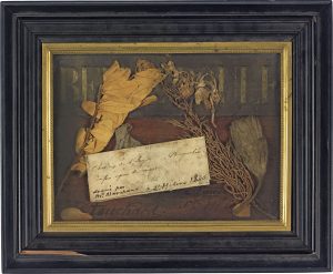 [NAPOLÉON Ier]. Reliques recueillies lors de l’ouverture du tombeau de Sainte-Hélène en 1840 ; sous cadre (à vue 11 x 15 cm, cadre baguette de bronze et bois noir 18,5 x 22,5 cm).