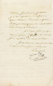 Très belle lettre militaire faisant le bilan des durs combats de Guttstadt, un mois après Eylau ; durant les deux premières semaines de mars, Ney résistera à 70.000 Russes avec seulement 14.000 hommes appuyés par le corps d’Armée de Soult. « Je me suis battu hier tout le jour, mon cher maréchal ; le but de l’ennemi était de me chasser de Zechern ; je ne vous ferai point le détail des attaques multipliées que nous avons repoussées presque sans intervalle depuis sept heures du matin jusqu’à dix heures et demie du soir ; l’ennemi y a montré un acharnement extraordinaire et une fureur aveugle : cette journée lui coûte au moins 2,000 tués ou blessés. Ma perte est de 2 à 300 hommes hors de combat ; cette grande différence provient de la supériorité de notre feu et des avantages du terrain. Aujourd’hui, l’ennemi continue à occuper avec environ dix mille hommes d’infanterie et de cavalerie la position de Launau ; la fumée des bivouacs fait présumer qu’il a encore une réserve vers Heilsberg. Mes troupes sont concentrées et prêtes à tout événement [...] Si l’ennemi faisait quelque mouvement prononcé d’offensive ou de retraite, je m’empresserai de vous en instruire »…