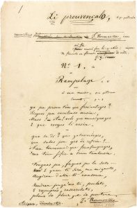 Important ensemble de poèmes provençaux de nombreux auteurs félibréens, recueillis par Roumanille pour son ouvrage collectif Li Prouvençalo, poésies diverses recueillies par J. Roumanille (Avignon, Seguin Aîné, 1852), deux ans avant la création du Félibrige. Certains poèmes sont de la main de leur auteur, parfois corrigés par Roumanille ; la plupart ont été retranscrits par lui ; ils sont généralement localisés et datés. Plusieurs sont dédiés à Roumanille. On relève quelques poèmes non retenus dans le recueil. Théodore Aubanel : La Vèuso, Requien, Lou vin cuieu, Li-z-enchaplaire de Daio suivi de Li Segaire (Avignon 1850-1851). F. Aubert: 2 fables, Mineto e Ratoun et Lou ratier et lou roussignou (St Rémy et Auriol 1851). Barthélemy : À l’autour de Chichois. J. Bastiéra : Lou Gibous que nèdo, conte (Cornillon 1851). Pierre Bellot : Per lou mariagi de Rosino et de Jeanet, Epitre, à moun ami Landais, À Moussu Jean Icard, À moun Courdounier que fasiet de marri vers, Lou Martegau et lou Singe doû Signour, Epitro à moun fillóu Duco, Lou Songi d’un voulur ou lou Boûmian counverti (Marseille 1851). G. Bénédit (Chichois) : Leis dous paysan à Tivoli (Marseille 1852). Pierre Bonnet : Quau voi emé li galino..., L’aloueto et sa fio, Lou caladaire e lou medecin (Beaucaire 1840-1851). Augustin Boudin : A moun ami Bigand pintre d’istori (Avignon 1851). Boufarel : A la Civado fèro (1851). Marius Bourrelly : Lou panier de figuos, Lou Provençau, Leis Voulurs, Jocrisso (conte) (Marseille 1850-1851). Denis-Casimir Cassan : Lou Goudroun (Avignon1850). Castil-Blaze : L’Ome prouposa (Elegia), Lou grand bal (Paris août 1851). B. Chalvet : Madeloun (Nyons 1851). Léonide Constans : L’adiou dou Cassaire à la Bastido (Toulon 1851). Antoine-Blaise Crousillat : À Dido, La Margaridetto, Eis Estellos, Adiéu, La Bono nouvello, Lou róure et la canetto (Salon 1851). A. D. [Dupuy] : À J. Roumanille, et Lou Bichou e lou tigre (Avignon 1851). Eugène Garcin :Roundèu, I troubaire di Prouvençalo (Alleins 1851). Jean-Baptiste Gaut : Brunetto (villanello) (Aix 1846). A. Gautier : Li dous mióu (Fablo imitado de La Fontaine), Li Dous pela (Fablo imitado de Florian), Lou grié e lou parpaioun (id.), Lagremo (Sonnet) (Tarascon 1851, plus une épreuve corrigée). Glaup (pseudonyme de Paul Giéra) : Li mau partaja, Uno bono fiero, À Moussu Bigand, Preditioun (1851). Jacques Jasmin : Sèn Bincèn de Pol (Toulouse 1851). Alphonse Maillet : L’avugle (La Tour-d’Aigues). Anselme Mathieu : Gatouno, Lou Riéu (Châteauneuf 1851). Auguste Moquin-Tandon : L’Aiga bouillida, et Lou papié timbrat (Toulouse 1851). Jean-Antoine Peyrottes : Lou Celibatari, La Filla del pople, Un cant sus una toumba, Ave Maris Stella (Clermont-l’Hérault 1842-1851). Camille Reybaud : Adiéu à ma muso Countadino, À J. R., Lou Roussignóu e la machoto, À Y. Z. quan anavo faire imprima soun libre de ver, À M. Carle (sonnet), Balado, À Aubery, À M. Plantovin de Cavailloun, Mei Veiado (sonnet), Nostro-Damo de Santa, Epitro à Moussu Requien (Nyons et Carpentras 1844-1851). Ricard-Bérard : Leis douas vouas (Pélissanne 1851). Joseph Roumanille : E Toinoun..., Lou Bon rescontre, À Bigand qui me fai moun pourtrè, L’aiglo e lou quinsoun, Paurío et Carita, Ma Vesino, Lou Moûnié, soun drole e l’ase (Fablo imitado de La Fontaine), Lou Mistrau (odo), Li dous Serafin, Rampelage (sonnet), Dideto (remembranço), L’Avaras (fablo), Se n’en fasiam un avouca (conte) (Saint-Rémy et Avignon 1840-1851). On joint quelques feuillets d’épreuves corrigées de la préface de Saint-René Taillandier.
