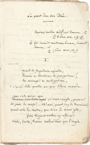 Manuscrit complet de ce poème, avec le brouillon partiel de la Dissertation sur l’orthographe provençale. L’ouvrage, et plus particulièrement sa préface, est d’une importance capitale pour la langue provençale, son lexique et son orthographe. Le poème La Part dau Bon Diéu a été publié en 1853 chez Seguin, précédé d’une Dissertation sur l’orthographe provençale, rédigée en français avec de nombreux exemples en provençal. Le manuscrit complet du poème provençal La part dau bon Diéu est soigneusement mis au net dans un petit cahier cousu ; il présente cependant quelques ratures et corrections. Il s’agit un long poème en 33 parties. Roumanille a noté en marge en tête du poème la date à laquelle il l’a commencé, le 13 avril 1853 ; à la fin, il a noté la date finale, Avignon 9 mai 1853. Le manuscrit en français de la Dissertation (56 pages) est un manuscrit de travail, avec de nombreuses ratures et corrections, et des variantes avec le texte définitif : de nombreux passages manquent, et le manuscrit s’arrête au début de la XIIe partie, alors que le texte en compte XX. On joint l’édition originale de La Part dau Bon Diéu (Avignon, Seguin aîné, 1853), brochure in-8.