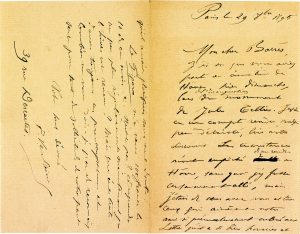 « J’ai su que vous aviez parlé au cimetière du Hâvre, hier dimanche, lors de l’inauguration du monument de Jules Tellier. J’espère en un compte rendu quelque peu détaillé, lire votre discours. Les circonstances m’ont empêché de me rendre au Hâvre, sans quoi j’y fusse certainement allé, mais j’étais de cœur avec vous et tous ceux qui aimèrent notre ami si prématurément enlevé aux Lettres qu’il a si bien honorées et qu’il aurait glorifiées sans nul doute »... Il se demande si Le Figaro, qui lui a versé 100 francs, ne pourrait pas reprendre ses paiements « un peu plus régulièrement maintenant que l’hiver est revenu »... On joint une gravure du buste de Jules Tellier.