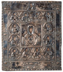 La Mère de Dieu “ Oranta”. Russie, XIXe siècle.Tempera sur bois. 31 x 26,5 cm.Oklad en métal argenté. Божия Матерь “Знамение”. Россия, XIXв.Дерево, темпера, 31,5 х 26,5...