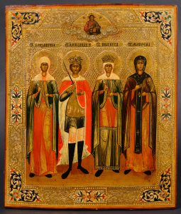 Saint Alexandre et sainte Praskeva, accompagnés de sainte Elisabeth et sainte Matrena. Russie, XIXe s. Tempera & or sur bois. 31 x 26 cm. Святой Александр, Святая Елизавета, Святая Праскева, Святая...