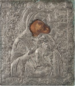 Vierge de Tendresse. Russie, XVIIIe - XIXe siècle.Tempera sur bois. 31,5 x 27 cm.Oklad en métal repoussé. Образ Божией Матери "Умиление". Россия, XVIIIв-XIXв.Дерево, темпера, 31,5 х 27...