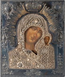 Marie mère de Dieu (Notre Dame de Kazan). Saint Pétersbourg, XIXe siècle. Tempera sur bois. 36,5 x 35 cm. Oklad en argent, vermeil, perles de verre et perles de rivière. ◊ ИВ. ◊ 84 ◊ ИЯ ◊ Saint...