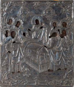 L'Assomption de la Vierge Marie. Russie, Voronège, 1854. Tempera sur bois. 31,5 x 27 cm. Oklad en argent. ◊ maître orfèvre : illisible ◊ essayeur : K• C (Klim Sergeiev), 1854 ◊ titre : 84 ◊ ville : Voronège. Успение...