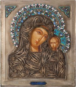 Marie mère de Dieu (Notre Dame de Kazan). Russie, 1896-1908.Tempera sur bois, 28 x 25 cm.Oklad en laiton. Second oklad en argent et en filigranes (◊ fK ◊ 84). Auréole en émaux cloisonnés.Manque six perles d’émail...