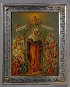 Lors d’un orage le 23 juillet 1888, l’usine de verre de Saint Pétersbourg fut incendiée. Mais cet incendie ne toucha pas l’icône de la Vierge consolatrice des affligés qui était cerclée de pièces. C’est pourquoi cette icône, comme la nôtre, est représentée avec des pièces autour de la Sainte Vierge.