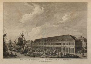 Dessinée par le chevalier de Lespinasse, dirigée par Née et gravée par Auvrai. Vue de la Bourse et du magasin des marchandises. Paris, [1784]. Gravure sur papier (25 x 35,5 cm à la cuvette, sur une feuille de 33 x 50 cm) sous vitre dans cadre en...