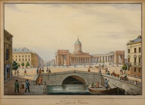 L’Eglise de Casan. Saint Pétersbourg, Pluchard, 1826. Lithographie couleurs (26 x 35,8 cm à la vue), sous passe partout et vitre. Nouvelle collection de 42 vues de St.-Petersbourg et des environs, dessinees d’apres nature par divers artistes....