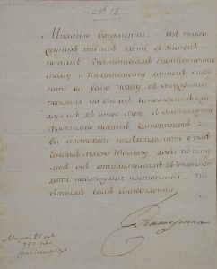 "Михайло Васильевич, из приложенных писем копий с указом наших губернаторам екатеринославскому и таврическому данных усмотрите вы волю нашу в разсуждении поселения на берегах черноморских ожидаемых в черное море с архипелаженою флотилиею наших единоверцев предуведомить о сем генерал-майора Тамару дабы по сему мог он отправляемым в черное море дать надлежащие наставления. пребываем вам благосклонны Екатерина”