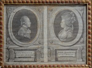 Johan Löschenkohl. Paul Petrowitz, Gran-Duc de Russie. Maria Feodorowna, Grande-Duchesse de Russie. Deux portraits gravés au burin, sur une feuille de papier (13,5 x 18,5 cm à la vue) dans un cadre vitré en bois doré. « Löschenkohl fec. Vienne...