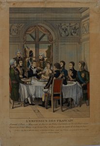 Император Французов дает обед Императору России, князю Константину, королю Пруссии, его супруге, принцу Генриху и герцогу де Бергу.