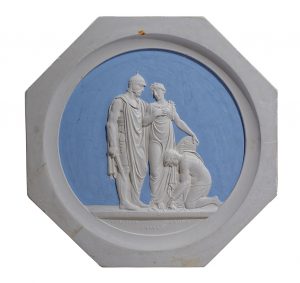 D’après Feodor Tolstoï. La libération de Berlin en 1813. Russie (?), XIXème s. Médaillon octogonal de plâtre, fond peint en bleu ciel, légende ; 20,5 x 20,5 cm. Une rousseur. Fait partie de la célèbre série de médaillons dédiés à la...
