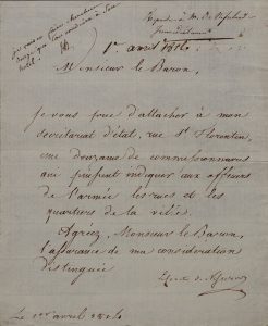 Comte de Nesselrode. Lettre signée à un baron ; en français. 1er avril 1814. Un feuillet manuscrit. Le Comte demande d’attacher à son secrétariat d’Etat rue saint Florentin une douzaine de commissionnaires qui puissent indiquer aux...