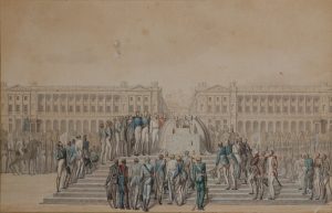 École russe ou française. La Pâque russe, célébrée sur la place Louis XV (place de la Concorde) à Paris le 10 Avril 1814, en présence de l’Empereur Alexandre et des souverains alliés, sur le front des troupes en armes. Paris, 1814....