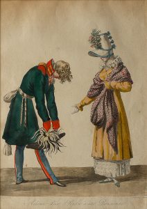 D’après Carl Vernet, gravé par Philibert Louis Debucourt. Le Cosaque Galant. Paris, vers 1820. Aquatinte. 34 x 24 cm à la vue ; sous vitre dans un cadre moderne. Dessin issu d'une série de gravures de Debucourt, d’après Carl Vernet,...