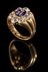 Références : Nous avons retrouvé aux Archives d’État de Saint Pétersbourg les documents (6 pages) qui concernent le don d’une bague fait par l’Empereur au Colonel Samuel Colt, citoyen des Etats-Unis d’Amérique du Nord et une autre à son compagnon de voyage Dickerson. Ces bagues sont référencées sous le numéro 985 (pour Colt) et 997 (pour Dickerson) dans la liste des bijoux conservés par le Cabinet de Sa Majesté. Ces documents précisent que Samuel Colt & E. Dickerson avaient offert à l’Empereur des pistolets-revolvers que Colt venait de fabriquer. Une photocopie de ces documents sera remise à l’acquéreur de cette bague.