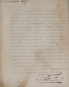 Alexandre Nicolaiévitch, césarévitch. Lettre signée au prince [Vorontzoff, gouverneur du Caucase] ; en français. Saint Pétersbourg, 14 février 1847. Une page manuscrite (secrétaire), signée du Césarévitch. Timbre à sec de l’Empereur...