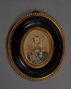 Portrait en buste de l’empereur Alexandre II. Ecole russe, vers 1860-1870. Aquarelle ovale (43 x 35 mm) sur papier fort. Dans un cadre de bois noir cerclé de laiton. Русская школа. Портрет императора...