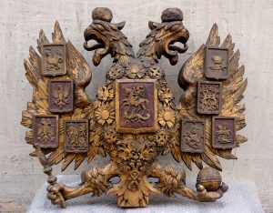 Aigle impériale russe. XIXe siècle. Bois assemblée & sculpté en ronde-bosse. 60 x 68 cm. Manquent les croix sommant les couronnes, et une partie du sceptre. Aigle impériale autrefois apposée sur la façade de bâtiments...