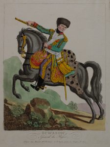 Suwarow, Général des Russes. Paris, Basset, vers 1799. Gravure en couleurs (32 x 24 cm à la cuvette, 42,5 x 26 cm hors-tout). Le général Suvorov est représenté à cheval, vers la gauche, tenant son bâton de maréchal. Stratège de génie,...