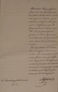 Comte Stroganoff auprès de l’Empereur d’Autriche, pour lui exprimer la profonde infliction qu’éprouve sa Majesté Impériale après le décès de Maria Feodorowna, belle-sœur de l’Empereur d’Autriche. Il lui confie les origionaus des lettres de condoléances, qu’il debra remettre lui-même à l’Empereur. Cette mission n’a rien de politique. Le Comte de Stroganoff déclinera donc toutes les questions concernant les puissances étrangères. Toutefois, le Comte Stroganoff devra rétablir la vérité sur la guerre contre les turcs, sur les opérations navales dans la Mer Noire. «La vérité exprimée froidement et avec une fermeté calme s’oppose d’une manière plus utile aux déclamations, et parle mieux à la conviction des hommes de bonne foi.»