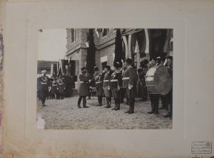 E. de Hahn. L’Empereur Nicolas II passant en revue les officiers garde-frontières. Livadia, 21 novembre 1911. Un tirage photographique (15 x 20,3 cm) contrecollé sur un carton à la marque du photographe. Au verso, grande marque de K. F. von Gan...