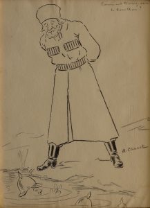 Albert Chanot (1881-1963). Cosaque narguant un Teuton tombé dans l’eau : “Comment trouvez-vous le bouillon ?”. Paris, vers 1925. Fusain (32,5 x 24,5 à la vue) ; sous vitre et dans un cadre doré. Альбер Шано (1881-1963)....