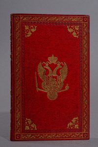 Том in-8°, переплет из красного марокена, богато украшенным золотым тисненым орнаментом и гербом НИКОЛАЯ I в центре крышек, корешок с бинтами, золотой обрез. Переплет Жермена Симье.