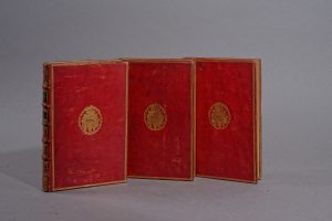 Три тома в цельнокожаном переплете из красного марокена, корешок с бинтами, заглавие на вставках из зеленой кожи, золотой обрез, ляссе из синего шелка, в центре крышек, обрамленных золотыми нитями, золотой герб графа Никиты Ивановича ПАНИНА.