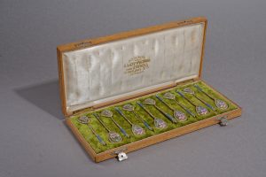 Серебро, позолота, эмаль, клейма: пробирные “84” и голова девушки в кокошнике, повернутой вправо, Москвы “дельта”, мастера “ЕА”, 10,3 см., одна ложка по рисунку отлична от других.